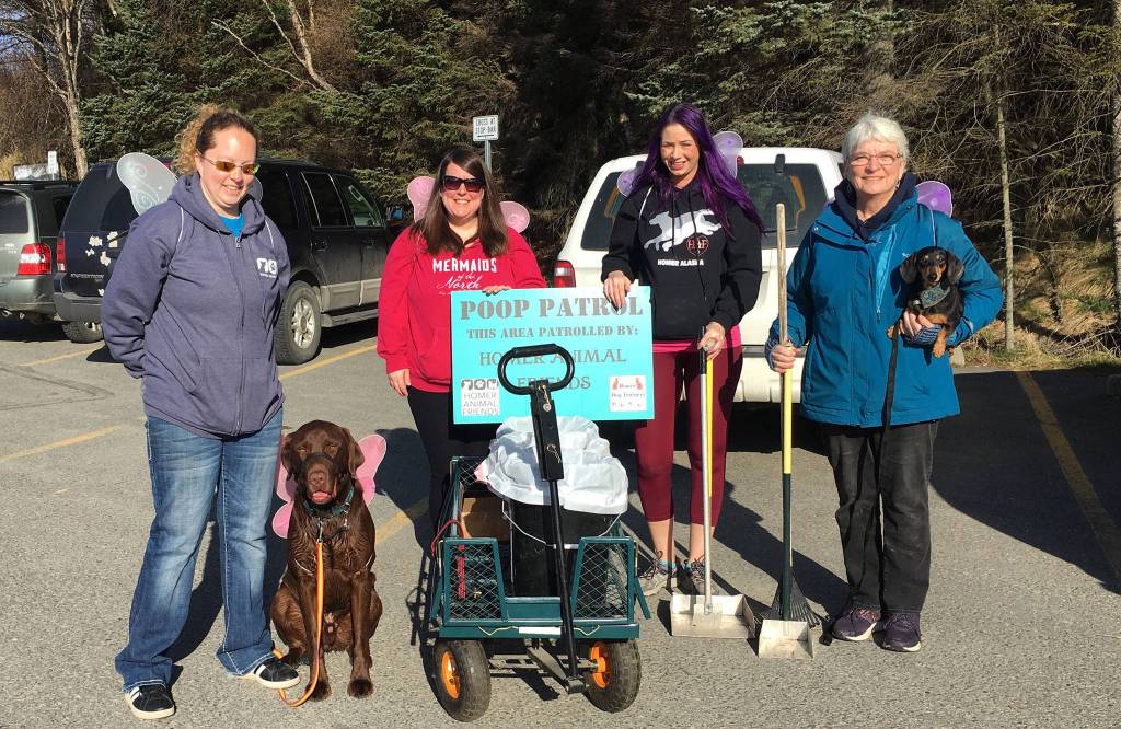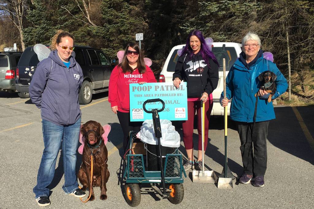 Members of the Homer Animal Friends participate in a Poop Patrol event on April 13, 2019 in Homer, Alaska. (Photo by Janelle Spurkland)