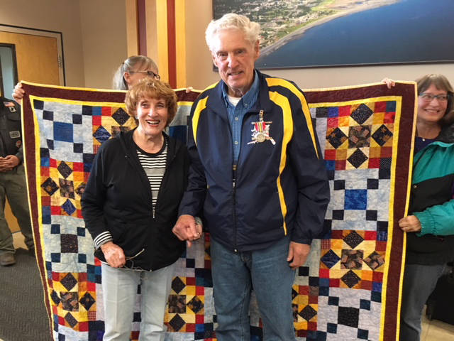 Veteran Robert Haynes, right, with his wife, Anne, receives a Quilt of Honor made by the Faith Friday Friends of Faith Lutheran Church. Haynes and Workd War II veteran Clem Tillion participated in the Last Frontier Honor Flight and received quilts upon their return to Homer. (Photo provided)