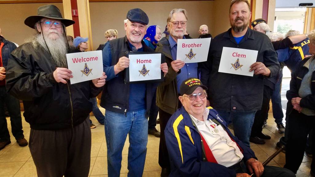 Members of the Homer Masonic Lodge turned out last Saturday, May 4, 2019, to honor World War II veteran Clem Tillion after his return on a Last Frontier Honor Flight. They also showed appreciation for his many years of Masonic service. In the photo standing behnd Tillion are, left to right, are Grady Svoboda, Tom Stroozas, Dave Spell and Greg Martin. Tillion took part in the Last Frontier Honor Flight, a trip that takes Alaska veterans to Washington, D.C. to see the sites and take in the memorials built in their honor.