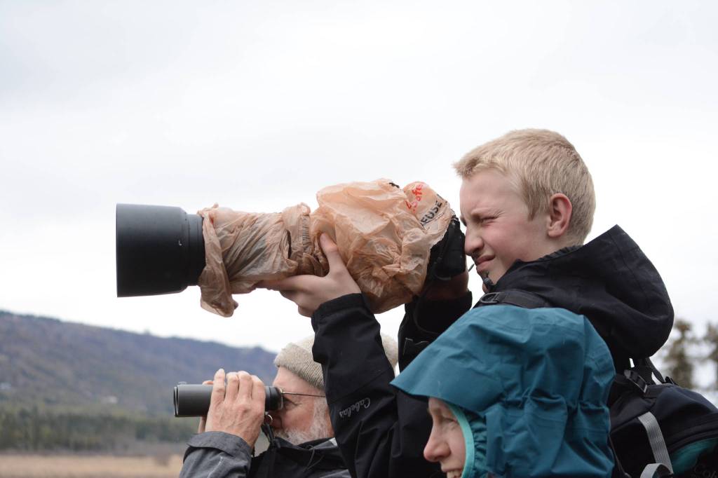 Josiah Verbrugge, 14, photographs birds with his mother, Heather Verbrugge, at Beluga Lake on May 10, 2019, in Homer, Alaska, during the Kachemak Bay Shorebird Festival. He rented the big lens just for the festival. (Photo by Michael Armstrong/Homer News)
