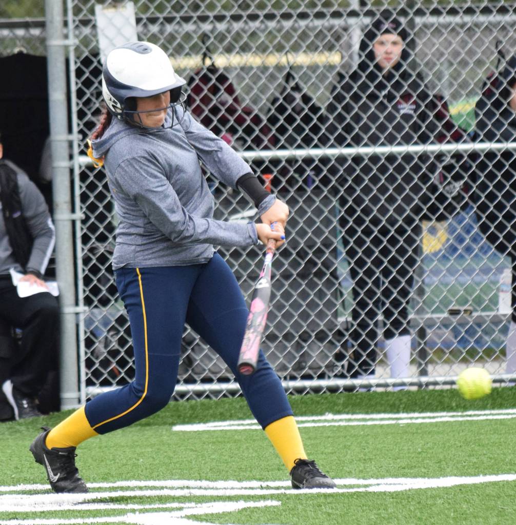 Homer’s Haylee Owen takes a swing at a pitch from Ketchikan at the Division II state softball tournament Saturday, June 1, 2019, at Cartee Fields in Anchorage, Alaska. (Photo by Joey Klecka/Peninsula Clarion)