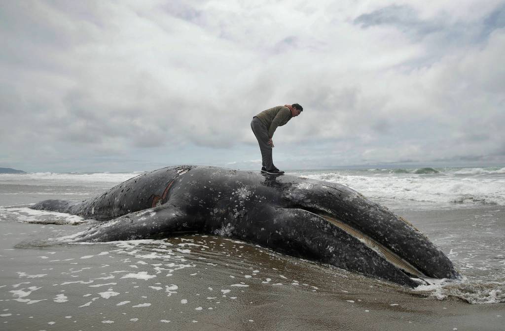 FILE - In this May 6, 2019 file photo, Duat Mai stands atop a dead whale at Ocean Beach in San Francisco. Federal scientists on Friday, May 31 opened an investigation into what is causing a spike in gray whale deaths along the West Coast this year. So far, about 70 whales have stranded on the coasts of Washington, Oregon, Alaska and California, the most since 2000. (AP Photo/Jeff Chiu)