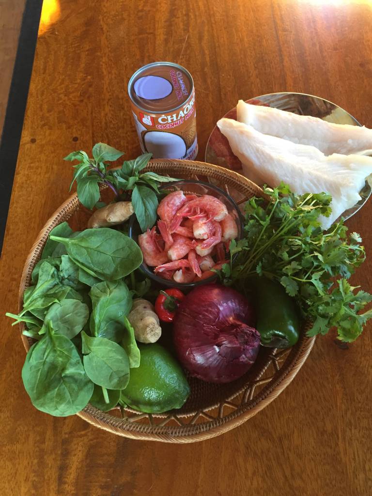 To serve divide rice among bowls. Top with seafood curry, basil and cilantro.
