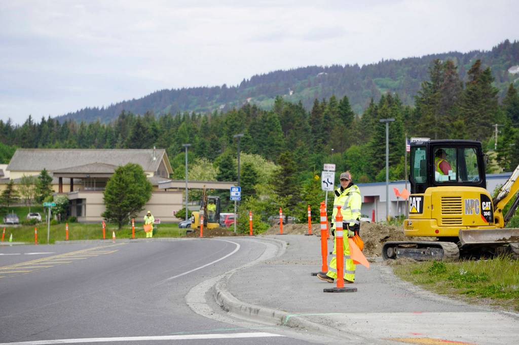 Flaggers direct traffic while workers install a fiber-optic line on the Homer Bypass to connect the Lake Street intersection traffic light with a new traffic light to be built at Main Street and the Homer Bypass on June 4, 2019 in Homer, Alaska (Photo by Michael Armstrong/Homer News)