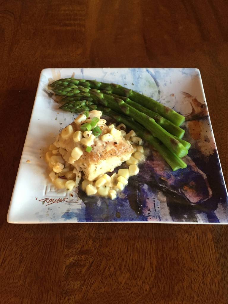 This recipe using sweet corn reminded me of that tasty dish in a different way and took much less time to prepare. The sweetness of the corn complements the delicate flavor of halibut. You will want to use a Chardonnay without a lot of oak as the sauce brings out the best in this halibut dish. It can also be made with good quality frozen corn with an added 2 tablespoons of water or stock to replace the liquid from fresh corn.
