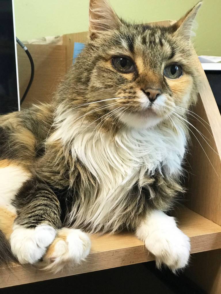 It’s been a long life on the road for this sweet, old lady. Cheyenne came to the shelter as a stray, but she didn’t skip a beat when it came to a good old fashioned snuggle time. She’ll perch on your shoulder and wrap herself around you like a purrfect furry scarf. She’s a great office cat, but the staff would love to see her in a home. She also qualifies for the Golden Paws program.