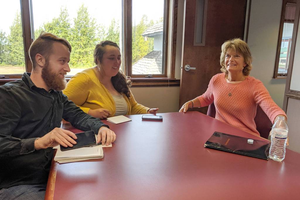 Clarion reporters Brian Mazurek, left, and Victoria Petersen interview Sen. Lisa Murkowski, R-Alaska, at the Peninsula Clarion in Kenai, Alaska, on Wednesday, Aug. 14, 2019. Murkowski discussed issues such as the Alaska Permanent Fund dividend, the Pebble Mine project and Alaska-related legislation. (Photo by Erin Thompson/Peninsula Clarion)