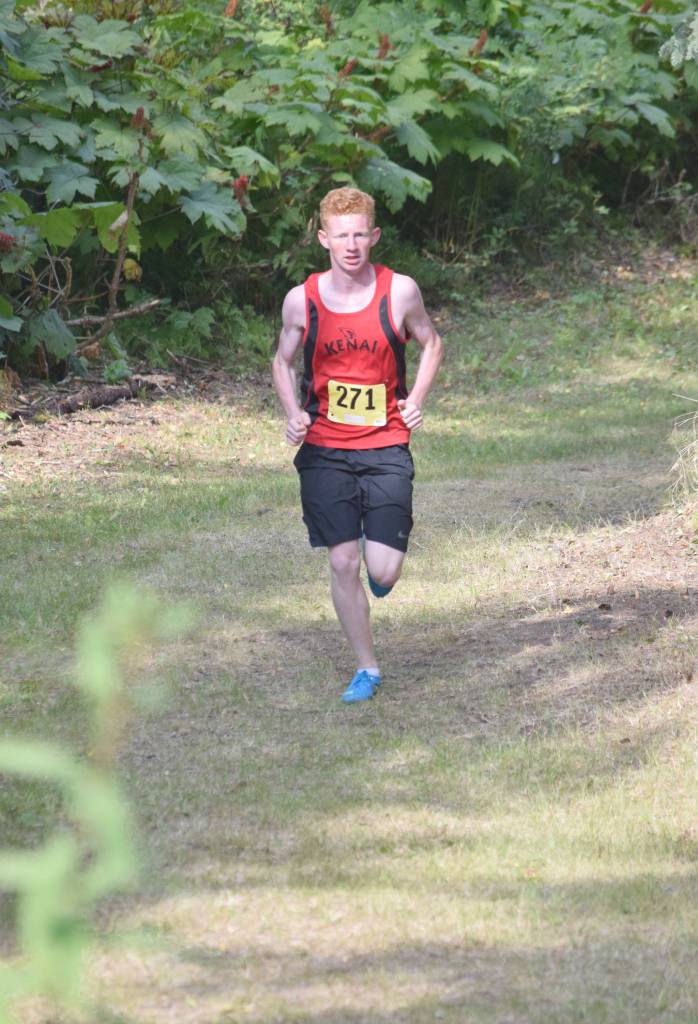 Kenai Central sophomore Joe Hamilton runs to victory in the freshman-sophomore boys race Monday, Aug. 19, 2019, in the Nikiski Class Races in Nikiski, Alaska.