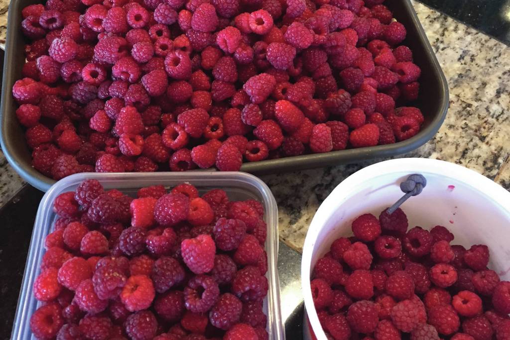 Photo by Teri Robl                                 Teri Robl collected some beautiful raspberries for her Raspberry Swamp Pie on Aug. 11 from her Homer, Alaska, garden.