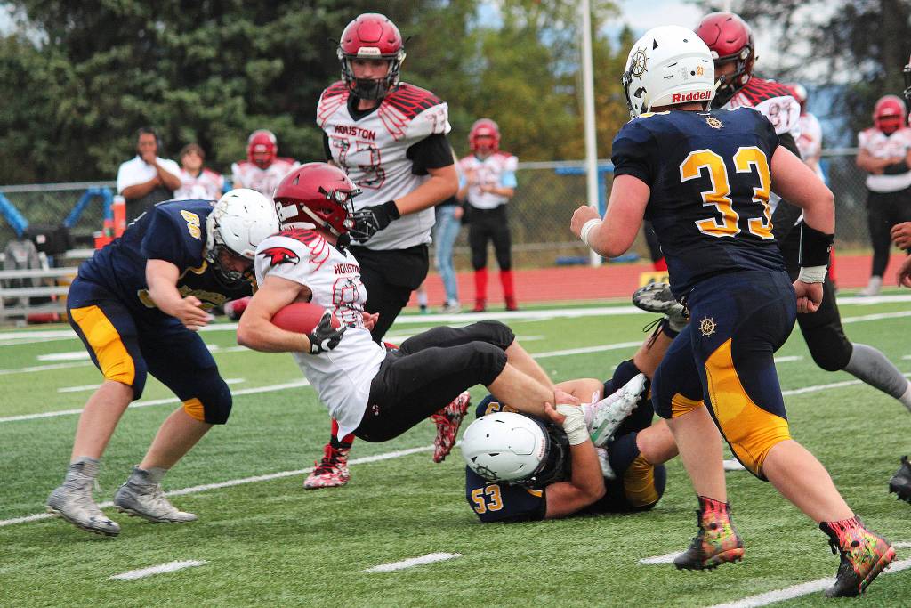 Homer’s Josh Manwiller (53) tackles Houston running back Owen Mulhaney during a Friday, Sept. 6, 2019 football game at the Mariner field in Homer, Alaska. (Photo by Megan Pacer/Homer News)