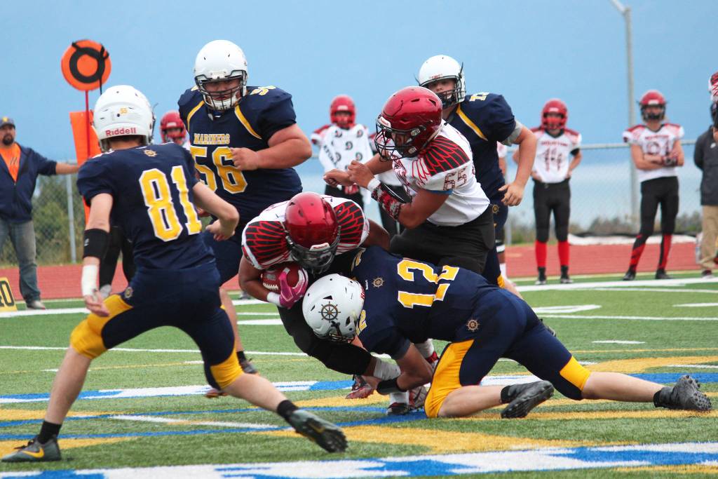 Homer quarterback Anthony Kalugin (12) tackles Houston’s Kennedy Fono during a Friday, Sept. 6, 2019 football game between the two teams on the Mariner field in Homer, Alaska. (Photo by Megan Pacer/Homer News)