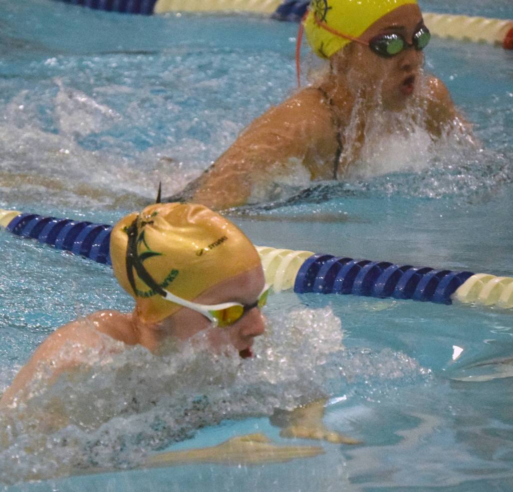 Seward’s Lydia Jacoby leads Homer’s Madison Story in the 50-yard breaststroke on Friday, Sept. 20, 2019 at the 2019 SoHi Pentathlon at Soldotna High School in Soldotna, Alaska. (Photo by Jeff Helminiak/Peninsula Clarion)