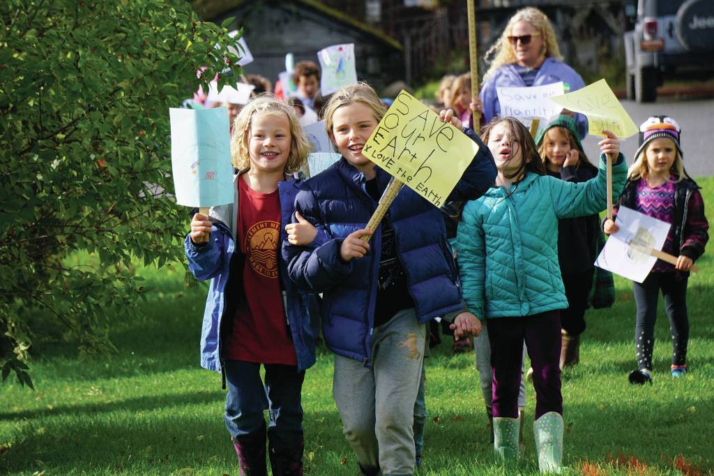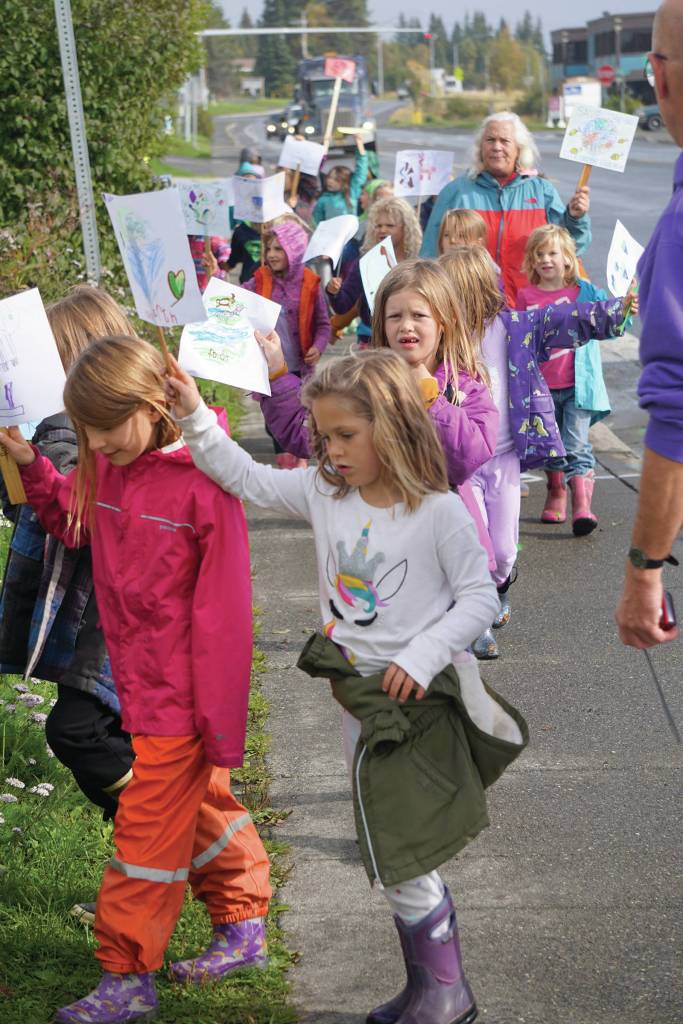 As part of their weekly Friday walks to local parks, Little Fireweed Academy students held a “We love the Earth March” to WKFL Park on Sept. 20, 2019, in Homer, Alaska. The kindergarten through second-grade students have been learning about ecology and animals and their connection to the earth. The march wasn’t associated with the Strike for the Climate held the same day. (Photo by Michael Armstrong/Homer News)