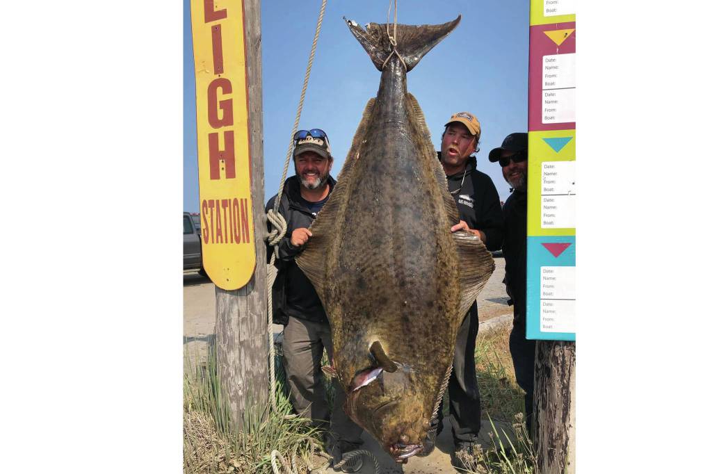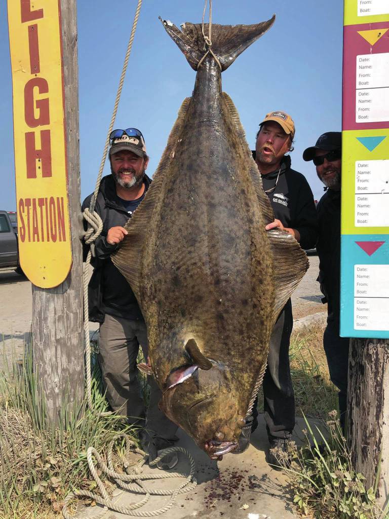 Homer Jackpot Halibut Derby winner Jason Schuler, left, of Wahpeton, North Dakota, poses with his 224.2-pound fish on July 12, 2019, in Homer, Alaska. To the right of the fish is Captain Daniel Donich of Daniel’s Personalized Guide Service. Schuler caught the fish on Donich’s boat, the Optimist. (Photo provided)