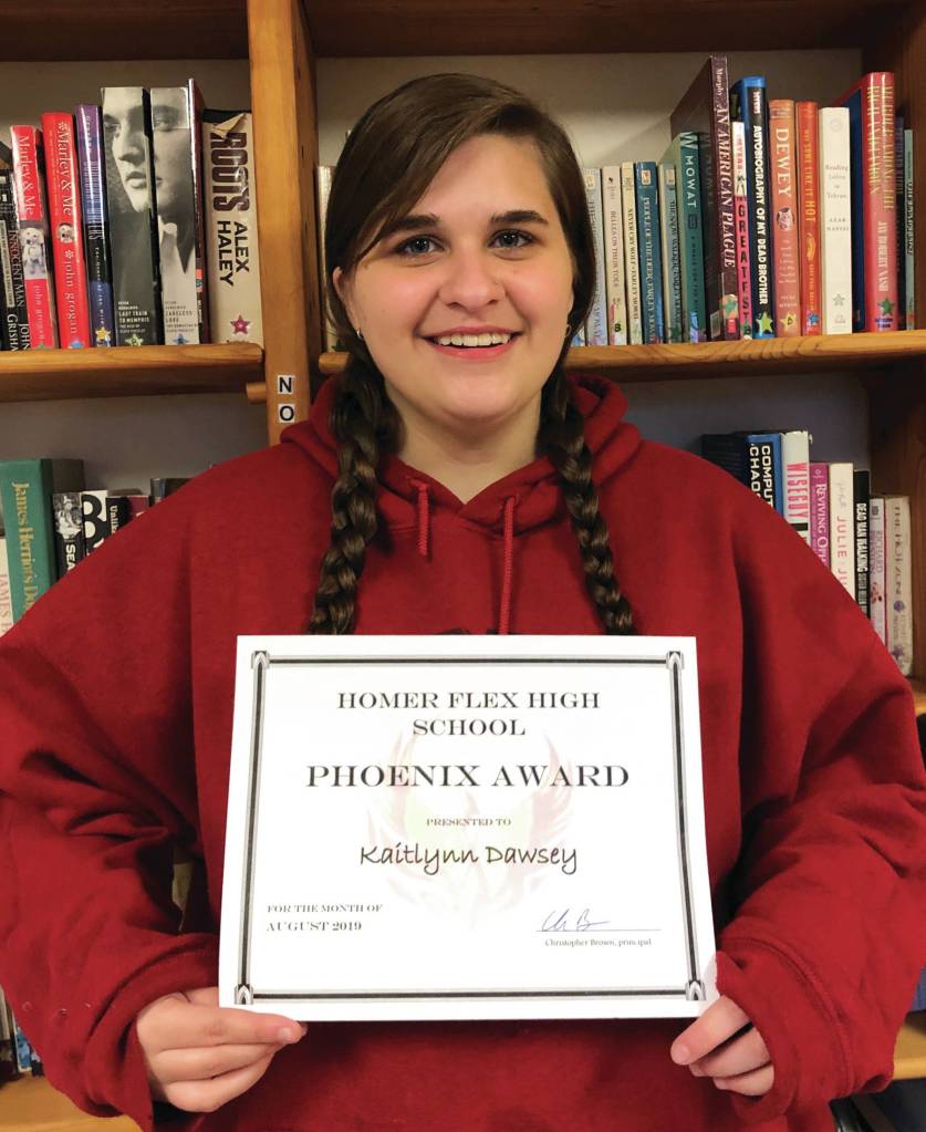 Sophomore Kaitlynn Dawsey is the recipient of the September Flex Phoenix Award. This award is given monthly to the student who represents the Homer Flex values of respect, ownership and productivity.