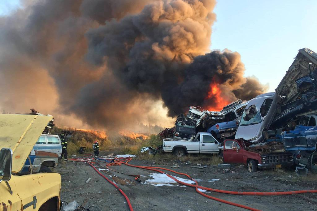 Personnel from Anchor Point Fire and EMS were dispatched at 6:12 p.m. on Monday, along with Alaska State Troopers, to respond to an outdoor fire on Greenfield Road, which is located off North Fork Road in Anchor Point. They found about 10 vehicles ablaze among a pile of scrap vehicles, according to a press release.