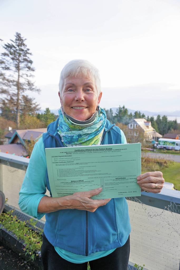 Fair Share Act sponsor Jane Angvik holds an initiative petition booklet she delivered to Homer, Alaska, on Oct 25, 2019. (Photo by Michael Armstrong/Homer News)
