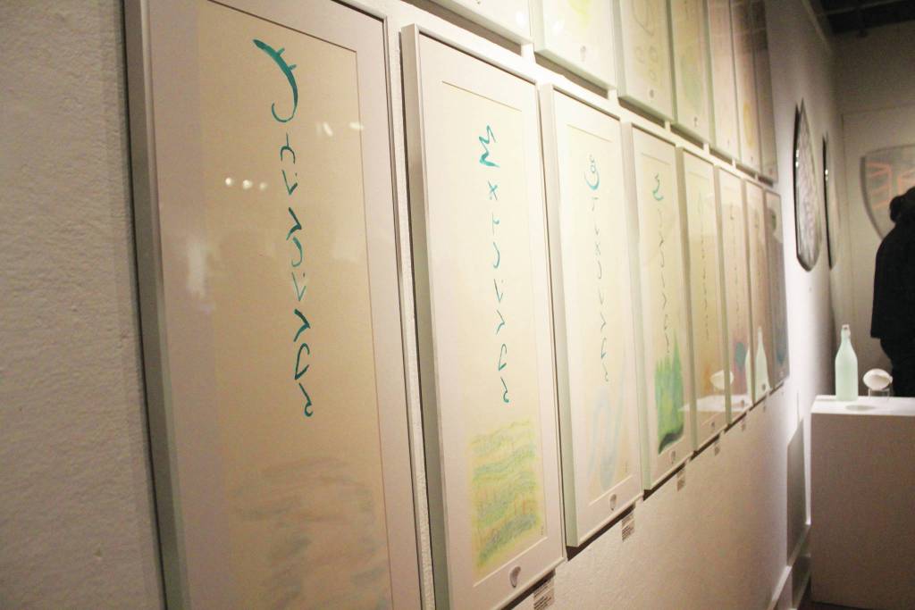 During his artist talk at the Friday exhibit opening, Kvasnikoff answered a question from a community member about his use of his created writing system for Dena’ina in his art. The symbols used to represent phonetic sounds of Dena’ina feature in most of his work, including Apollonic Mirror paintings and Dnayi Scroll paintings on display Friday. He now includes them in pieces habitually, Kvasnikoff said.