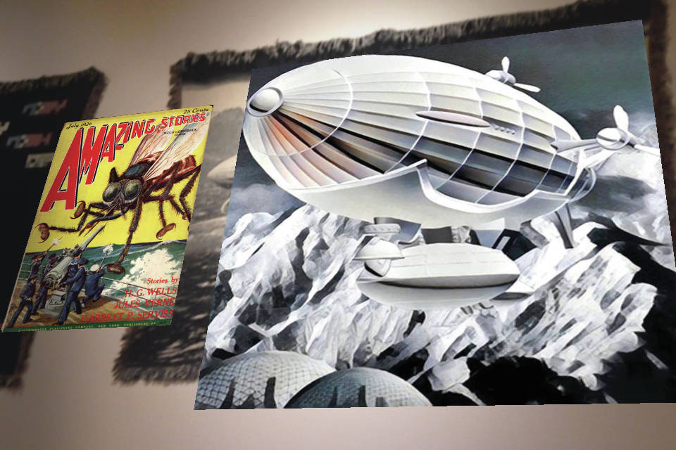 Shafer’s 2018 Pratt Museum show exhibited art from his “Dirigibles of Denali” book, an anthology about domed cities in Alaska’s interior. Shafer uses augmented reality, or AR, a digital technique that adds layers of images to two-dimensional works through smart phones or tablets. With an app, the viewer holds the smart phone over a painting or printed page, and a code in the work causes an image to appear on the smart phone. The app Shafer used for his Pratt show no longer functions, and he’s working with a developer to do a new app.