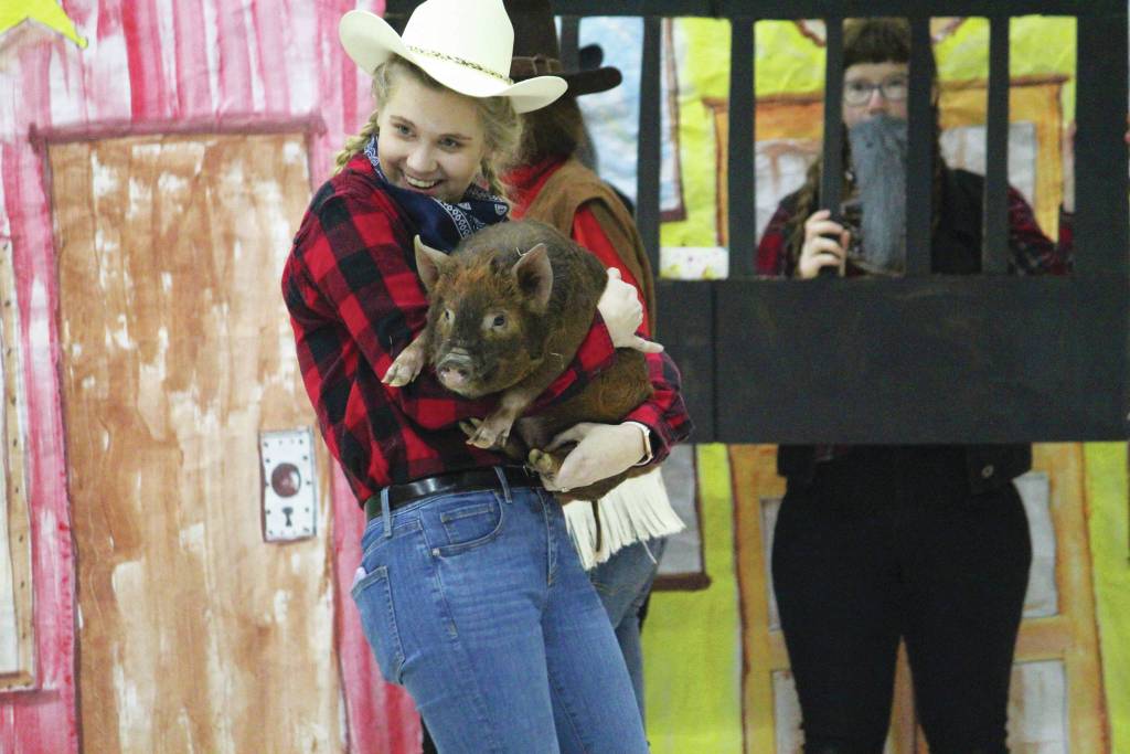 The premise of this year’s skit put on by teachers and staff was that the townsfolk in an old Western town were in search of a pig to be shown off at the local fair. As luck would have it, a famous pig named Guinevere was all lined up to attend the fair, but was “pig-napped” by a gang of bandits. The only way to get Guinevere the pig back, Pedersen told the students, is to reach their 150,000-minute reading goal.