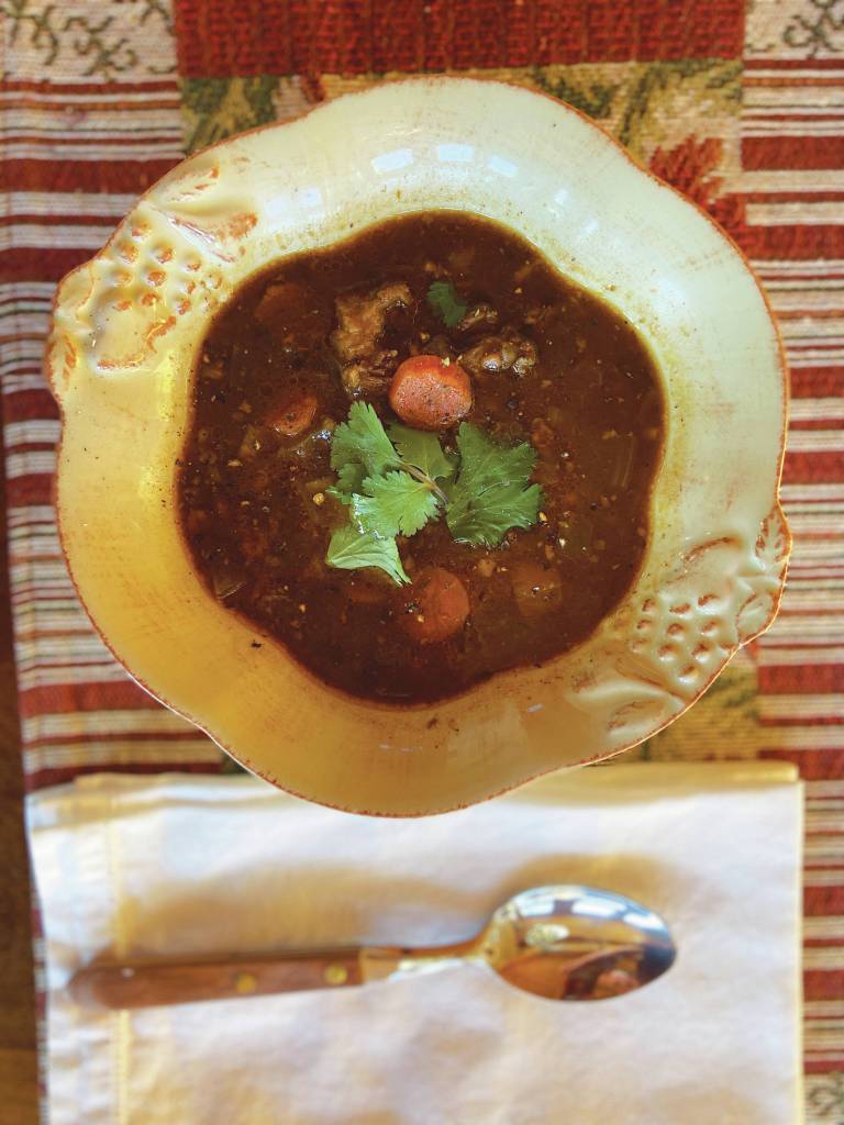 The secret ingredients in Teri Robl’s Oxtail Soup with Root Vegetables and Barley are beef oxtails, as seen here in a soup she made in her kitchen on March 10, 2020, in Homer, Alaska. (Photo by Teri Robl)