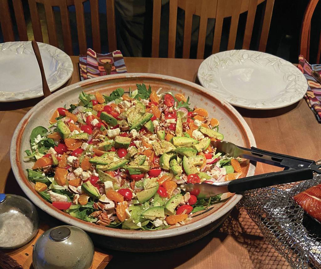 Susan Alvarez made Teri Robl’s strawberry baby spinach and romaine salad with warm citrus shallot vinaigrette on Feb. 7, 2020, at Alvarez’s home in Homer, Alaska. (Photo by Teri Robl)