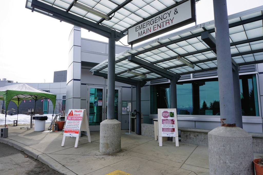 Signs on Saturday, March 28, 2020, at the main entrance to South Peninsula Hospital in Homer, Alaska, warn visitors not to enter until they have been met by hospital staff. (Photo by Michael Armstrong/Homer News)