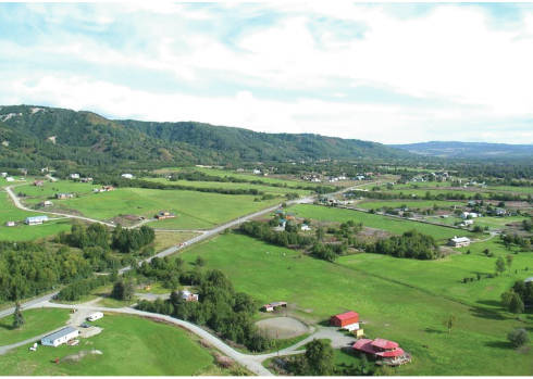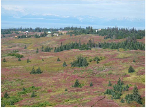 Coalesced alluvial fans form the Homer Bench. Beluga and Smokey Bay soils formed in the slope alluvium derived from the bluffs of the Kenai Formation in the background. (Photo courtesy Doug Van Patten)