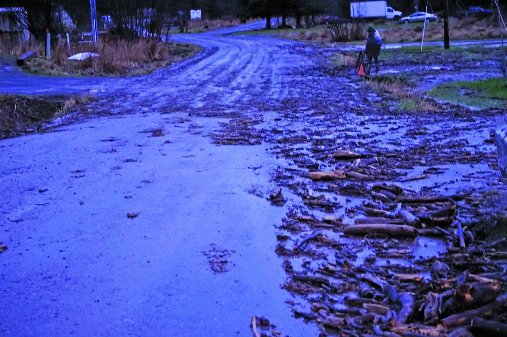 Debris from a flood fills ditches along Meadow Drive near East End Road on Monday afternoon, Dec. 9, 2019, in Homer, Alaska. Bear Creek crosses East End Road near Bear Creek Drive and overflowed the creek banks. (Photo by Michael Armstrong/Homer News)