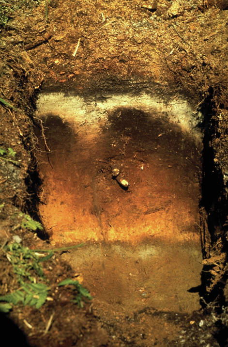 In soils, there is a taxonomy (scientific classification) similar to plant and animal taxonomies. As my father-in-law would say, it’s the “fancy name” for everything. The highest taxonomic level is the soil order. All soils in the world can be placed in one of 12 orders. Mutnala soils are Spodosols, which are probably among the most photogenic of soil orders. Spodosols are common in the Pacific Northwest, upper Mid-West, and New England. Vegetation has a role in the development of these soils. Water percolating through the organic surface layer leaches down through the upper mineral layer, combines with iron and aluminum, and is translocated from this horizon and deposited below. This results in a whitish horizon above a reddish-brown subsurface layer. The process is called podozolization.