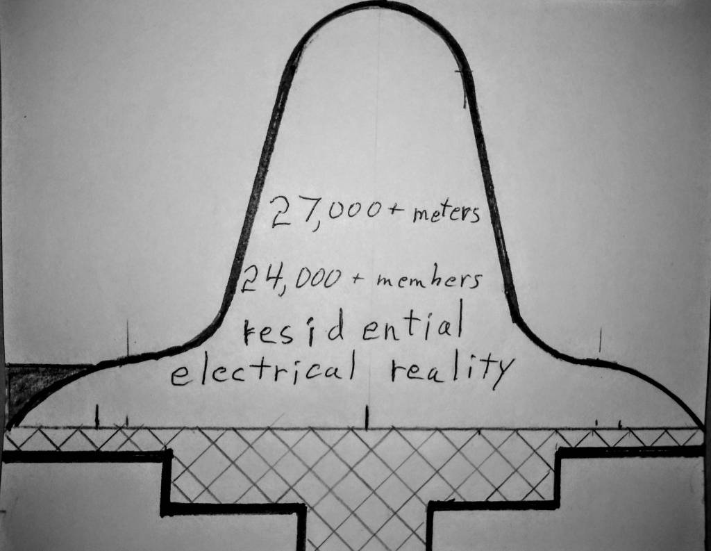 In this figure, the bell shape is the distribution curve of electrical consumption, kilowatt hours are plotted on the X-axis, members (meters) are plotted on the Y-axis. The cross-hatched area beneath the X-axis represents the customer charge. The small blot in the lower left-hand corner is the SDC. (Graph by Tom Maloney)