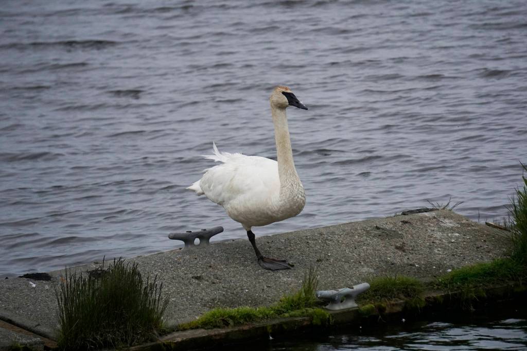 A trumpeteer swan sits on a dock at Beluga Lake on Monday evening, June 8, 2020, in Homer, Alaska. (Photo by Michael Armstrong/Homer News)