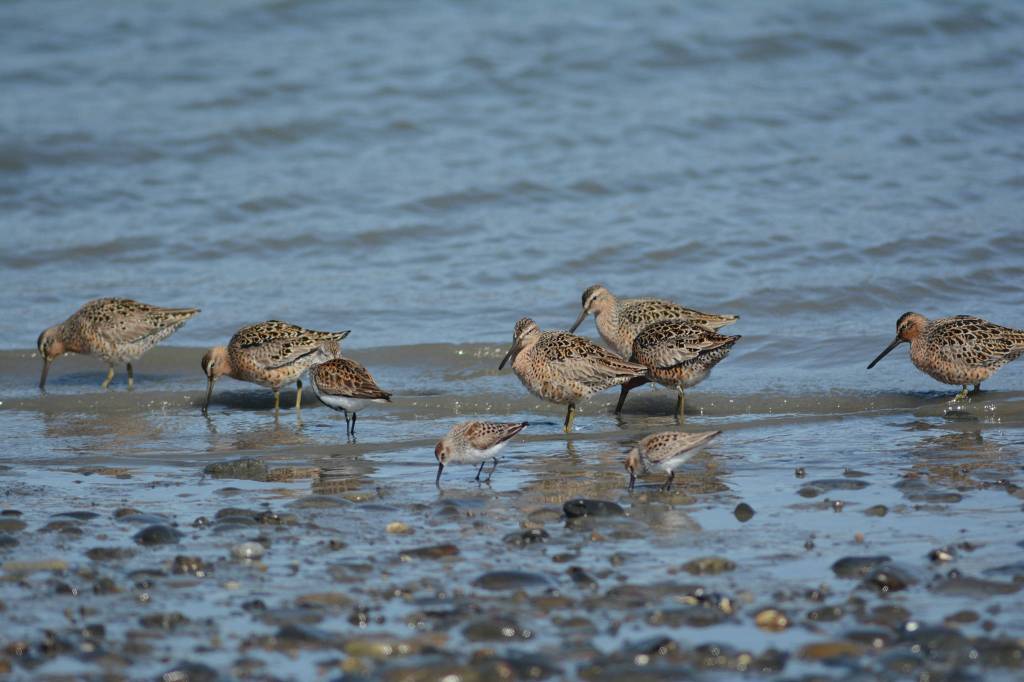 There is a point where there will be no birds and then suddenly the birds burst into sight, except they have been there all along. I had that moment on the beach. A group of dunlins, dowitchers, Western sandpipers, black bellied plovers and semipalmated plovers snapped into view. I had my camera and a 300 mm long lens. All seeing should not be through a camera, so I alternated taking photos, looking through my binoculars and spotting scope, and taking photos.
