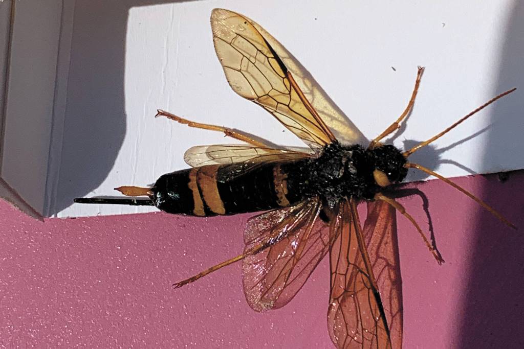 We have more wood wasps this year than ever. You may have noticed them too. Huge, beautiful with what looks like a giant stinger but it is actually a ovipositor to lay eggs in trees. Once again I thank Janice Chumley, retired Integrated Pest Management technician, for making the ID and explaining how the insect works. I used to see them when we lived at Mile 15 East End Road, but its been a while and they are here in droves this summer. Fear them not for they are harmless although they certainly don’t look it.