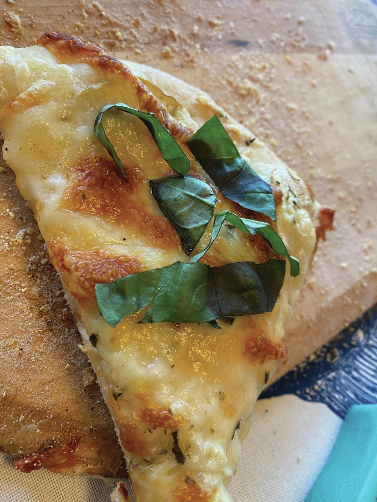 Transfer pizza to a lightly greased pizza pan or baker’s peel dusted with cornmeal and flour. Bake in pre-heated oven for about 10 minutes, depending on thickness and toppings or until golden brown. Let baked pizza cool for 5 minutes before cutting and serving.