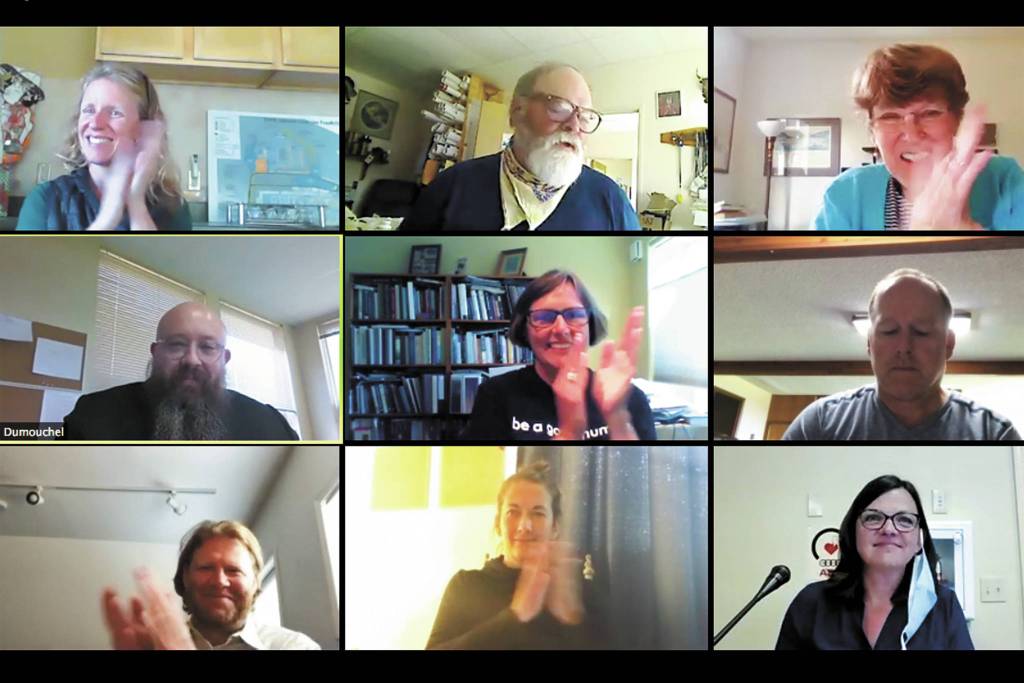 Members of the Homer City Council clap as City Manager Rob Dumouchel is sworn in during the council’s Monday, Aug. 24, 2020 meeting at Homer City Hall in Homer, Alaska. Dumouchel is Homer’s newest city manager. (Photo by Megan Pacer/Homer News)