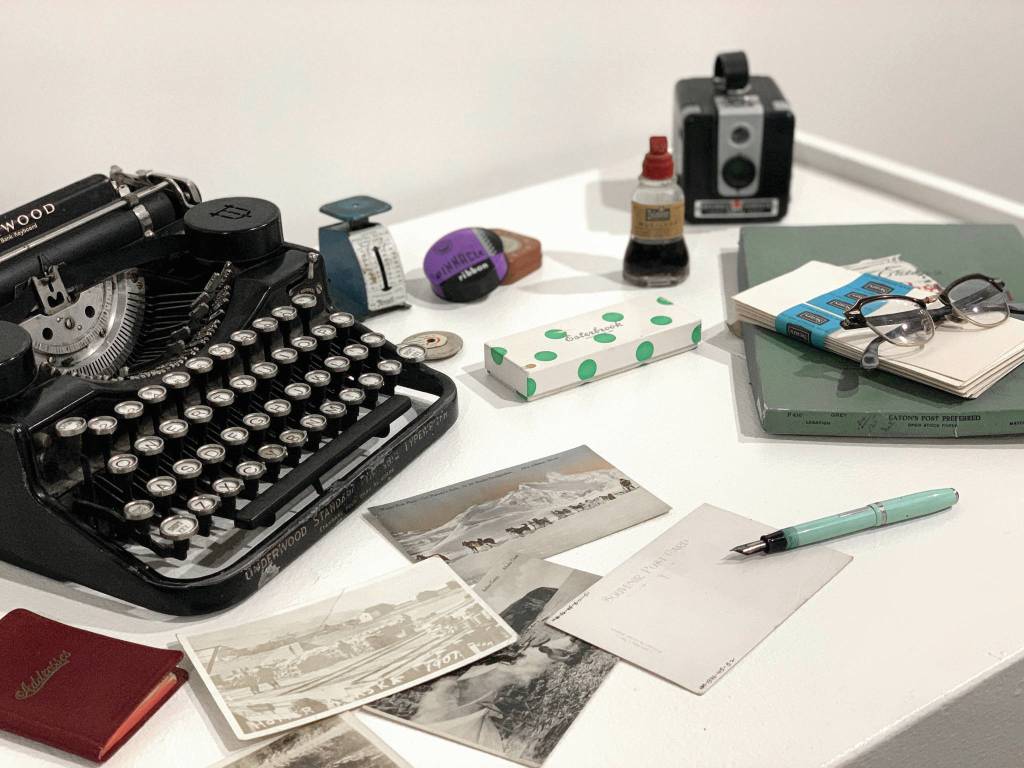 A display from the Pratt Museum’s “Greetings from the Past: History in Postcards” show old postcards, front, an address book, lower left, an Underwood typewriter, upper left, various office supplies, and a Kodak Brownie camera, upper right. The exhibit opened Thursday, Oct. 22, 2020, at the Pratt Museum in Homer, Alaska. (Photo courtesy Pratt Museum)