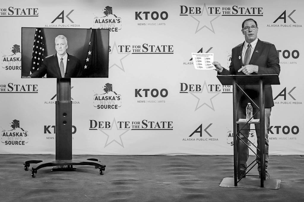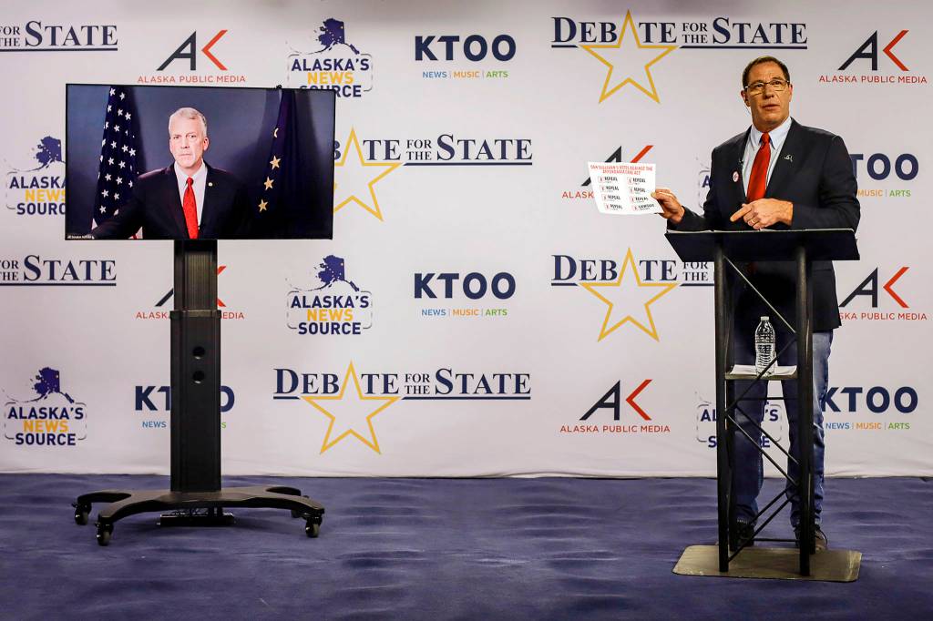 Republican U.S. Sen. Dan Sullivan and Democratic-supported independent Al Gross somewhat shared the Anchorage debate stage; Sullivan, who appeared on a monitor beside Gross, participated from Washington, D.C., where the Senate prepared to vote on President Donald Trump’s nomination of Amy Coney Barrett to the U.S. Supreme Court.