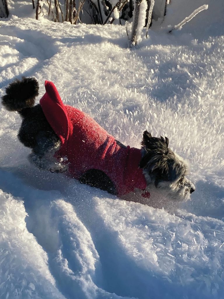 We’ll take him out back in his little red fleece jacket and let him run. Sometimes he gets riled up and gets what we call the zoomies, a manic tearing around in circles or up and down the trails. This past fall he got into a barking match with a moose, and when the moose didn’t like it, I had the horrible vision of seeing Fletcher run down the path straight toward me with a moose on his tail. He outran the moose. The moose veered into the woods. Whew.