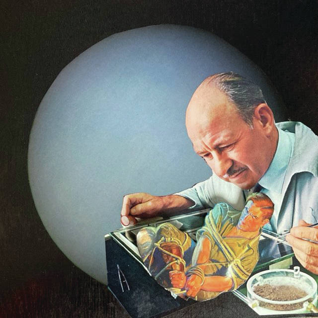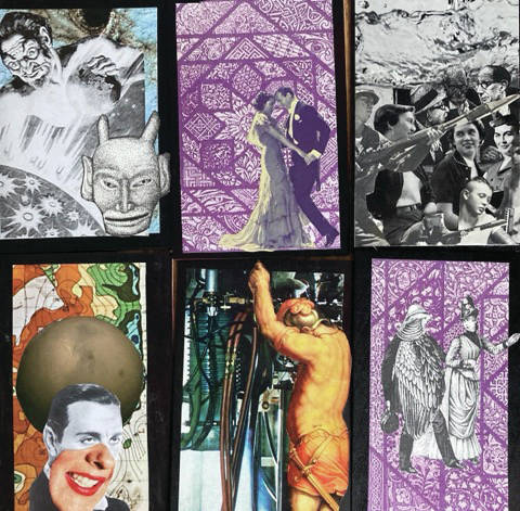 Aguilar finds the images for his collages mostly from old books. Locally, the bookstore An Observance of Hermits has been a treasure trove for him.