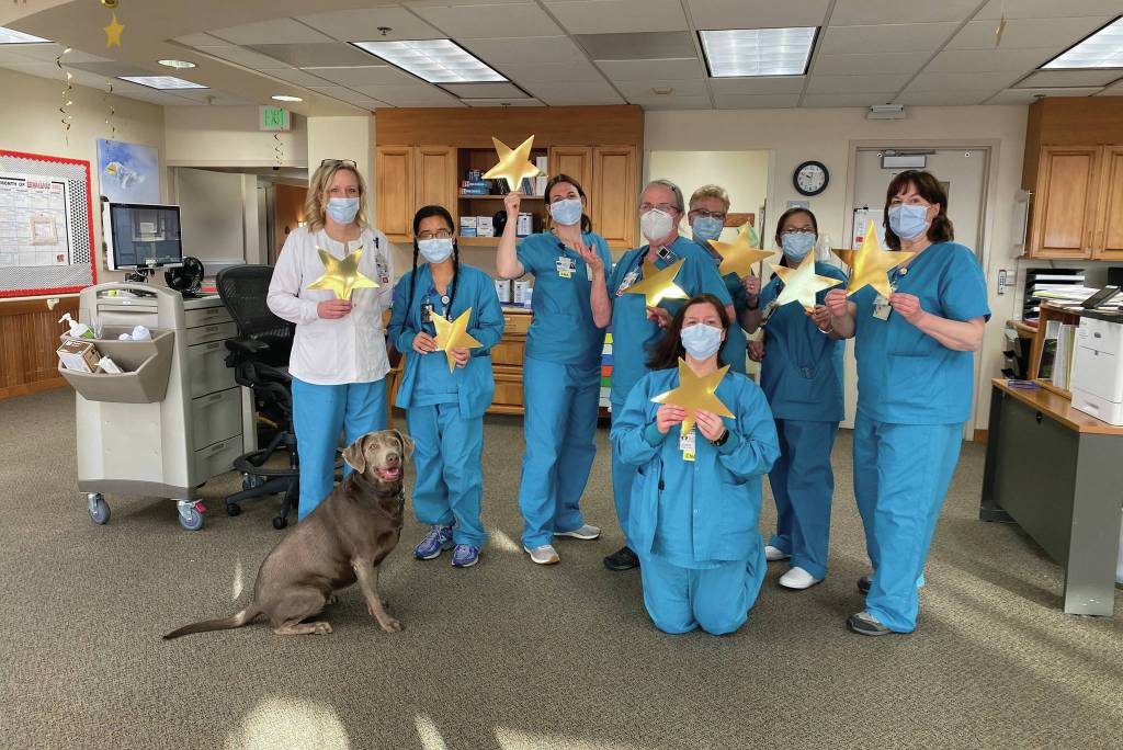 Long Term Care staff celebrate receiving the five-star rating from the Centers for Medicare & Medicaid Services on Feb. 19, 2021, at South Peninsula Hospital in Homer, Alaska. From left to right are Cathy Myers, Director of Nursing; Bella the dog, Nanet Minke, Certified Nursing Assistant; Nicole McKinney,CNA; Bonnie Betley, Registered Nurse; Susan Hubbard, CNA, Ana Jones, CNA; Leone Morra RN; and Melissa Dunkle CNA, in the front kneeling. (Photo courtesy South Peninsula Hospital)