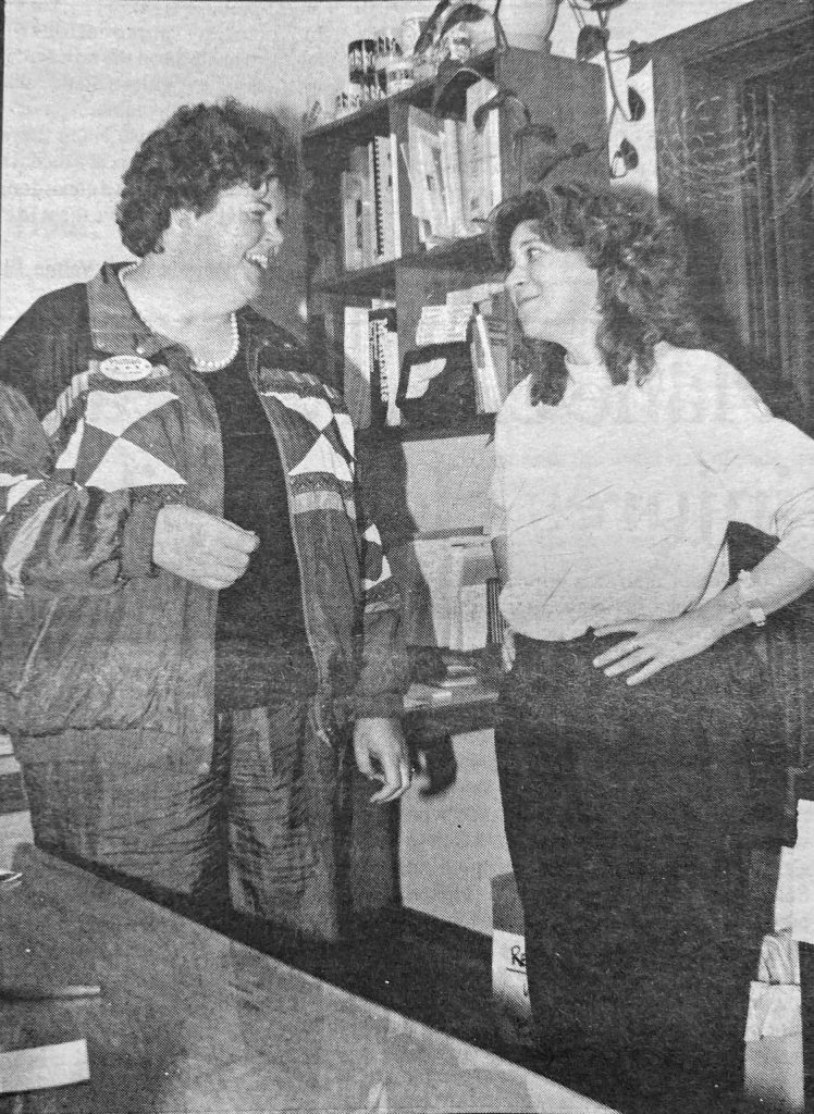 In this Sept. 10, 1992, file photo, then Rep. Gail Phillips, left, and Democratic Party challenger Susan Kernes, right, shared a lighthearted moment at the KBBI Public Radio studios on Sept. 1, 1992, in a campaign event. Phillips won re-election that year. (Photo by Hal Spence/Homer News file photo