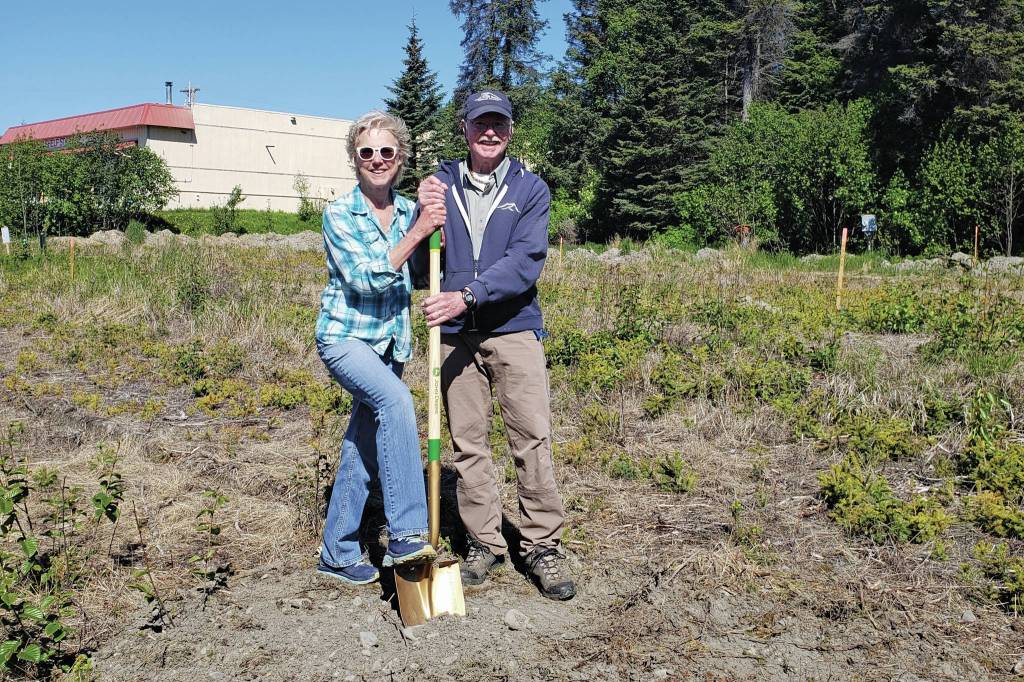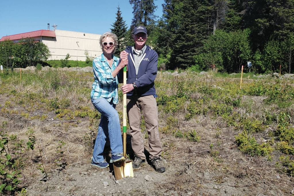 Sherry Stead, left, and Don Stead, right, pose on Sunday, June 6, 2021, at the groundbreaking of the new building for Grace Ridge Brewery at 870 Smoky Bay Way. Jay-Brant Contractors has started construction of the brewery, tasting room and beer garden to be completed by next fall. (Photo courtesy of Grace Ridge Brewery)