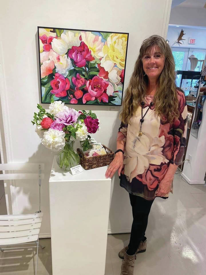 Gerri Martin poses with her show, "Peonies: Alaska's Floral Gems," for First Friday, July 2, 2021, at Fireweed Gallery in Homer, Alaska. (Photo courtesy of Gerri Martin)