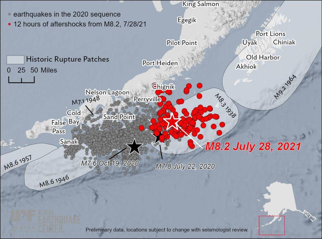 Since 1900, there have been eight other earthquakes magnitude seven or greater within about 155 miles of Wednesday’s rumble. It is believed that the magnitude 7.8 quake on July 22, 2020, and the 7.6 on Oct. 19, 2020, were foreshocks to Wednesday’s rattle outside of Perryville, according to the Alaska Earthquake Center.