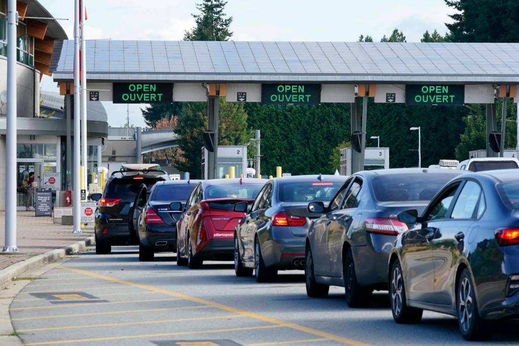 In Washington state at the Peace Arch Border Crossing and Historical State Park, three lanes of vehicles with Washington state license plates waited to cross the border Monday morning. Wait times were about 30 minutes at 11 a.m.