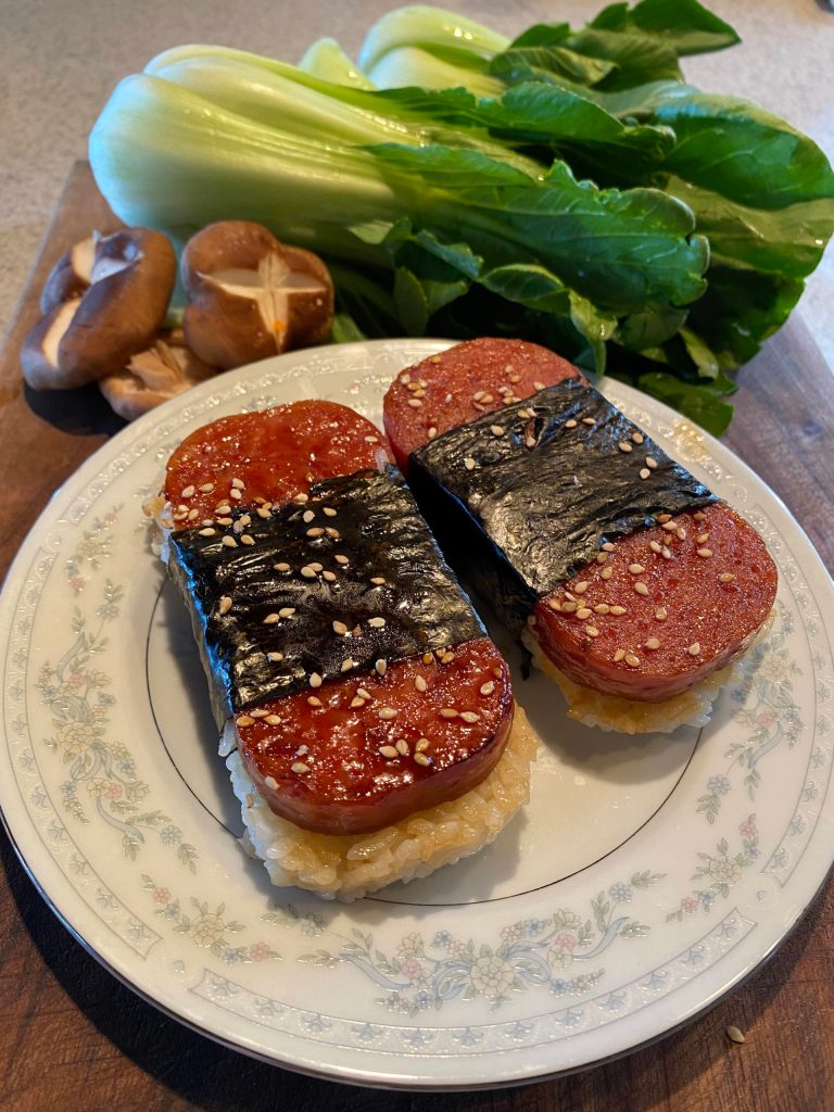 We ate sushi in an outdoor restaurant, seated on the floor at the low table, surrounded by roaming chickens and the hibiscus-scented breeze. Our first idyllic beach trip ended with windows down, music up, well-practiced harmonies, and an iconic road snack: Spam musubi.
