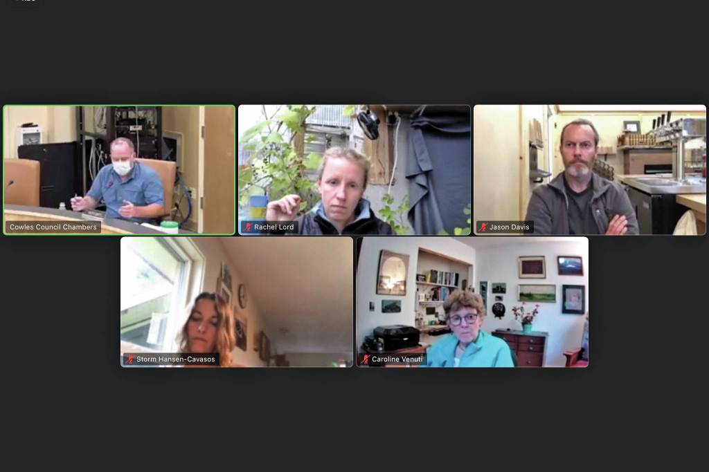Under the hybrid meeting plan, four council members, including newly appointed member Jason Davis, attended using the Zoom online platform while two others met with Mayor Ken Castner in the COVID-19 cautious Cowles Council Chambers. All members physically present wore masks under the city’s new guidance requiring face coverings in public areas at all city facilities.