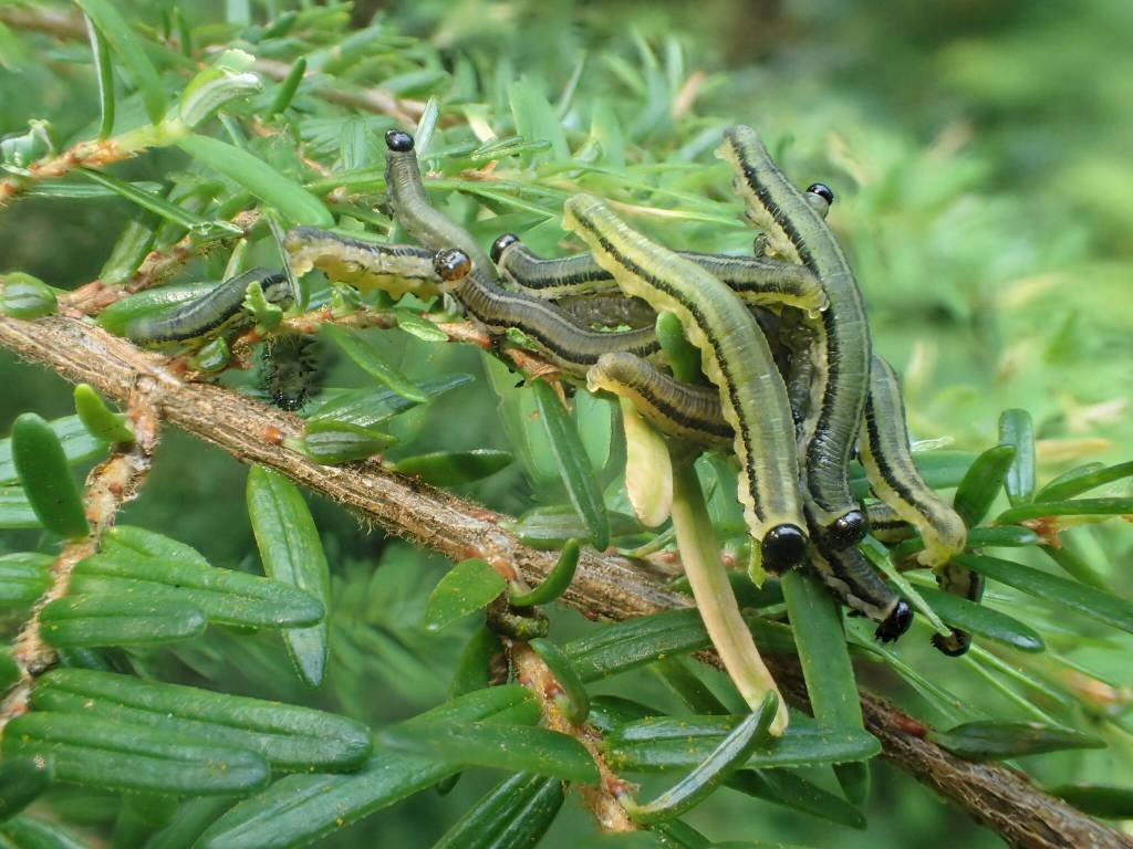 Those moths, which live for several weeks, lay their eggs on hemlock needles. Eggs are laid on a one-per-bud basis to avoid pitting larvae against one another for food, Graham said. Then, in the summer, around the same time that the buds burst, the caterpillars burst and begin mining the buds before moving on to new growth. While hemlocks are a preferred host, Graham said, other coniferous trees, including Sitka spruce, may also provide food and shelter to black-headed budworms.