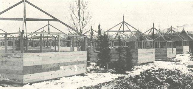 Tent platforms for interned Japanese-Americans stand at Fort Richardson Internment Camp in February 1942.
